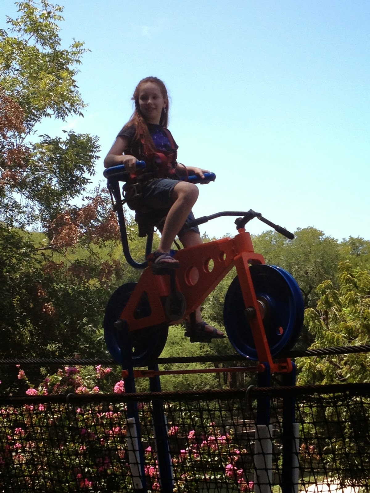 And, biking across a suspended cable, high up in the air, backwards...
