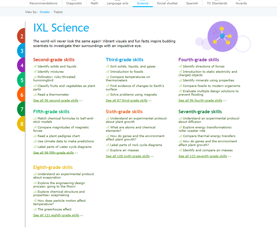 The main section of IXL is the Learning. When your student logs into their account, they immediately see program recommendations, base on their past use. But, your student can also choose what skills they want to work on.